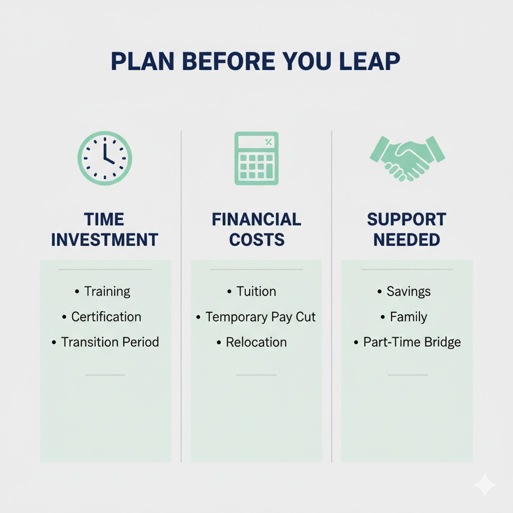 Create a realistic timeline, assess your financial runway, and identify what support you’ll need to bridge the gap.