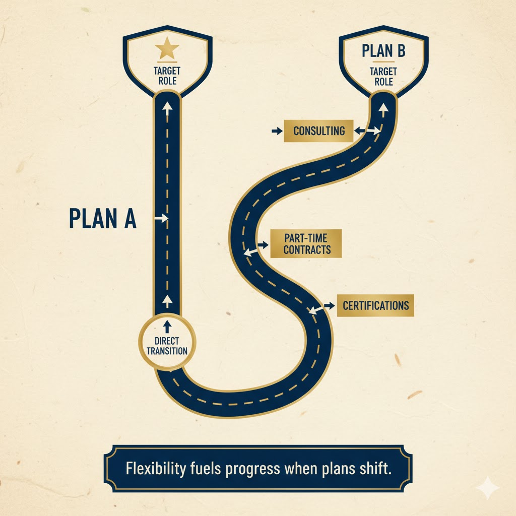 If your first path takes longer than expected, what’s your bridge plan? Consulting? Fractional work? Contract roles?