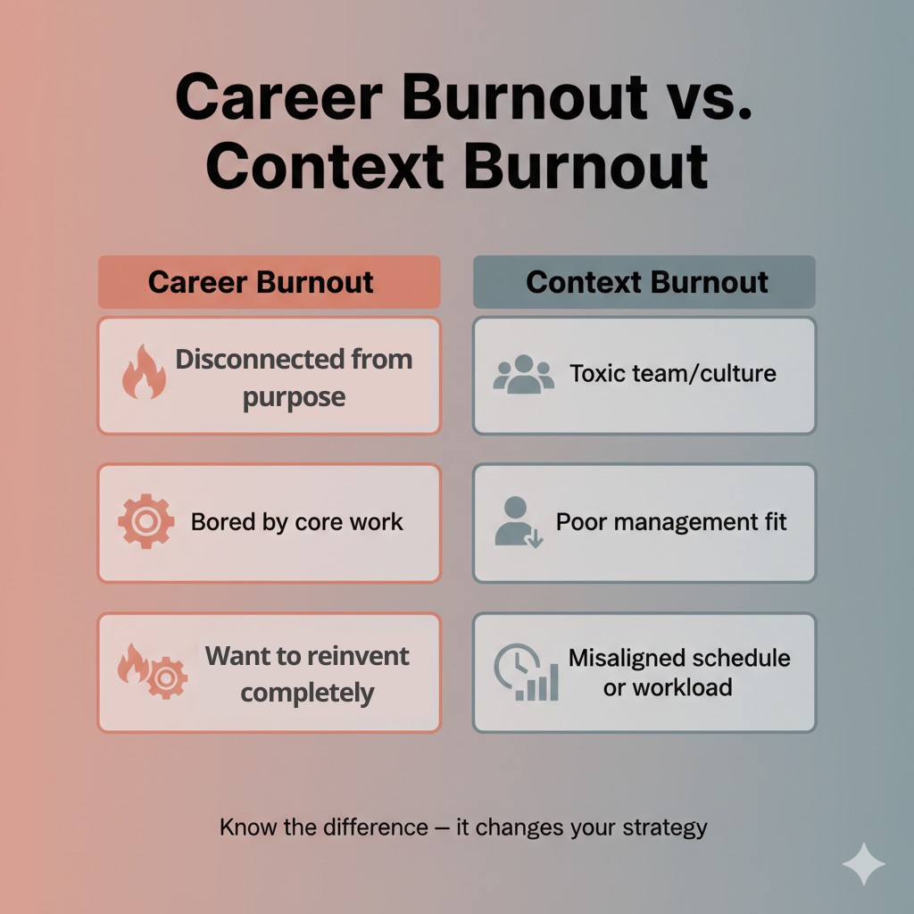 (At FutureKickoff, we often see that what feels like “career burnout” is actually “context burnout.” Knowing which one changes the strategy.)