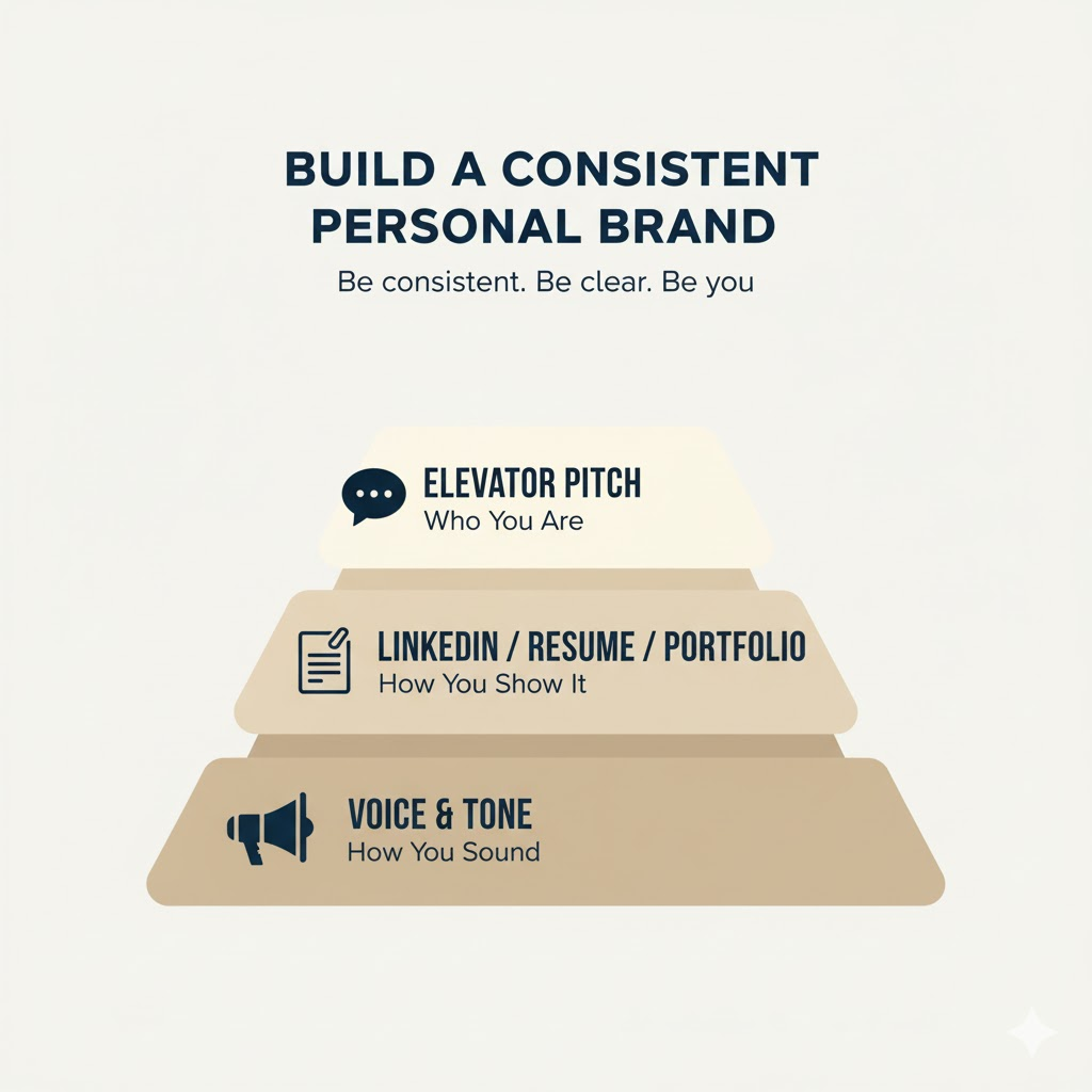 Your résumé, portfolio, and LinkedIn should sound like versions of the same story — consistent, credible, and confident.